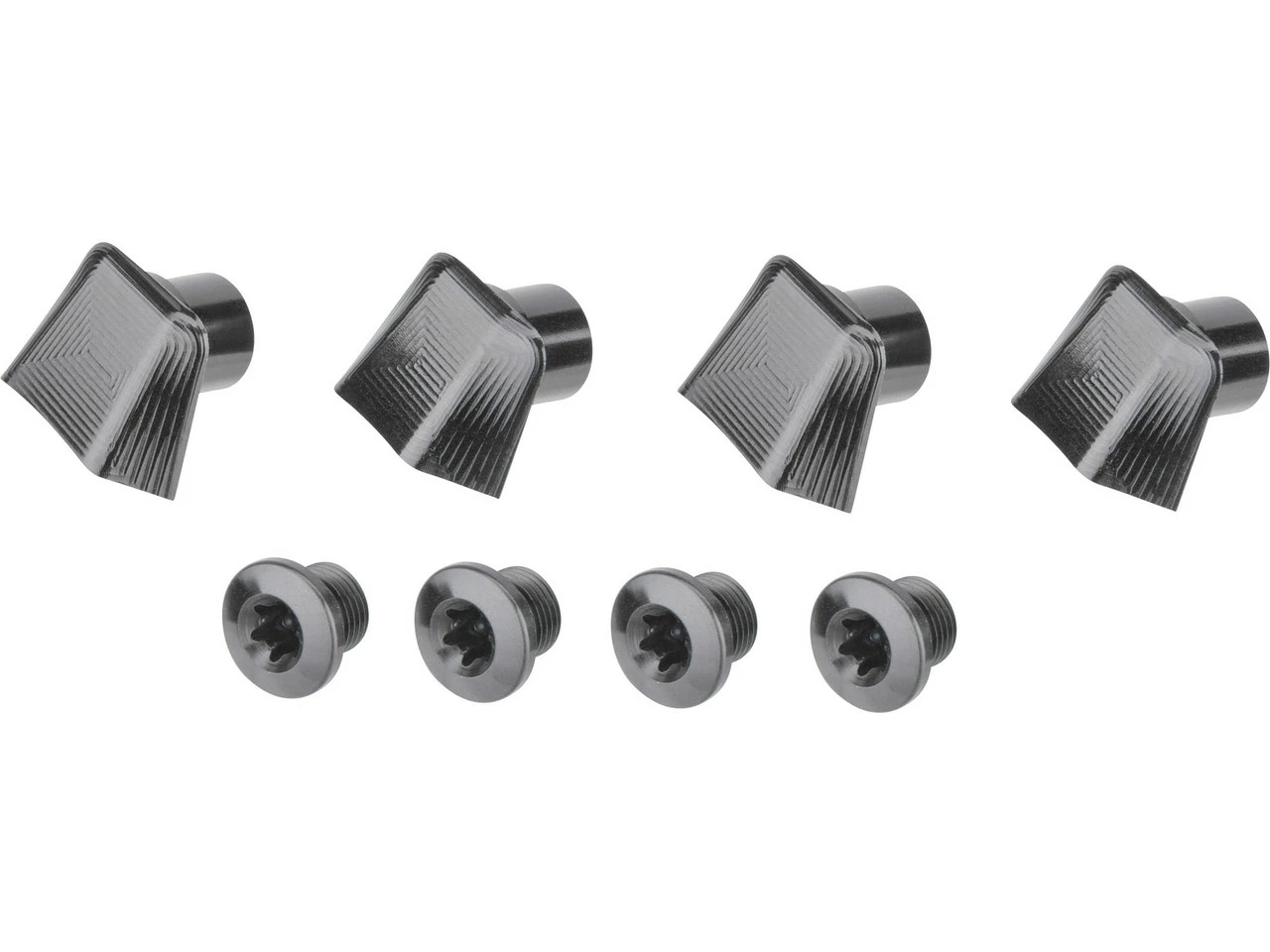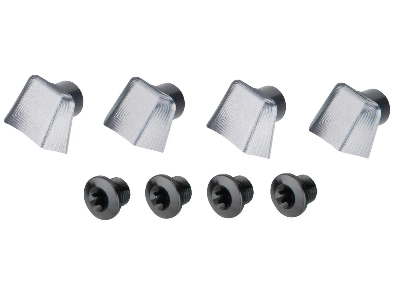 Estos tornillos de plato y protectores para tornillos de platos han sido lanzados por absoluteBLACK especialmente para bielas de ruta Dura-Ace R9100 de Shimano. Así camuflaras el pequeño espacio entre el brazo de la biela y tu plato absoluteBLACK. El set consta de cuatro tornillos y cuatro tuercas, que sirven a la vez de protectores.