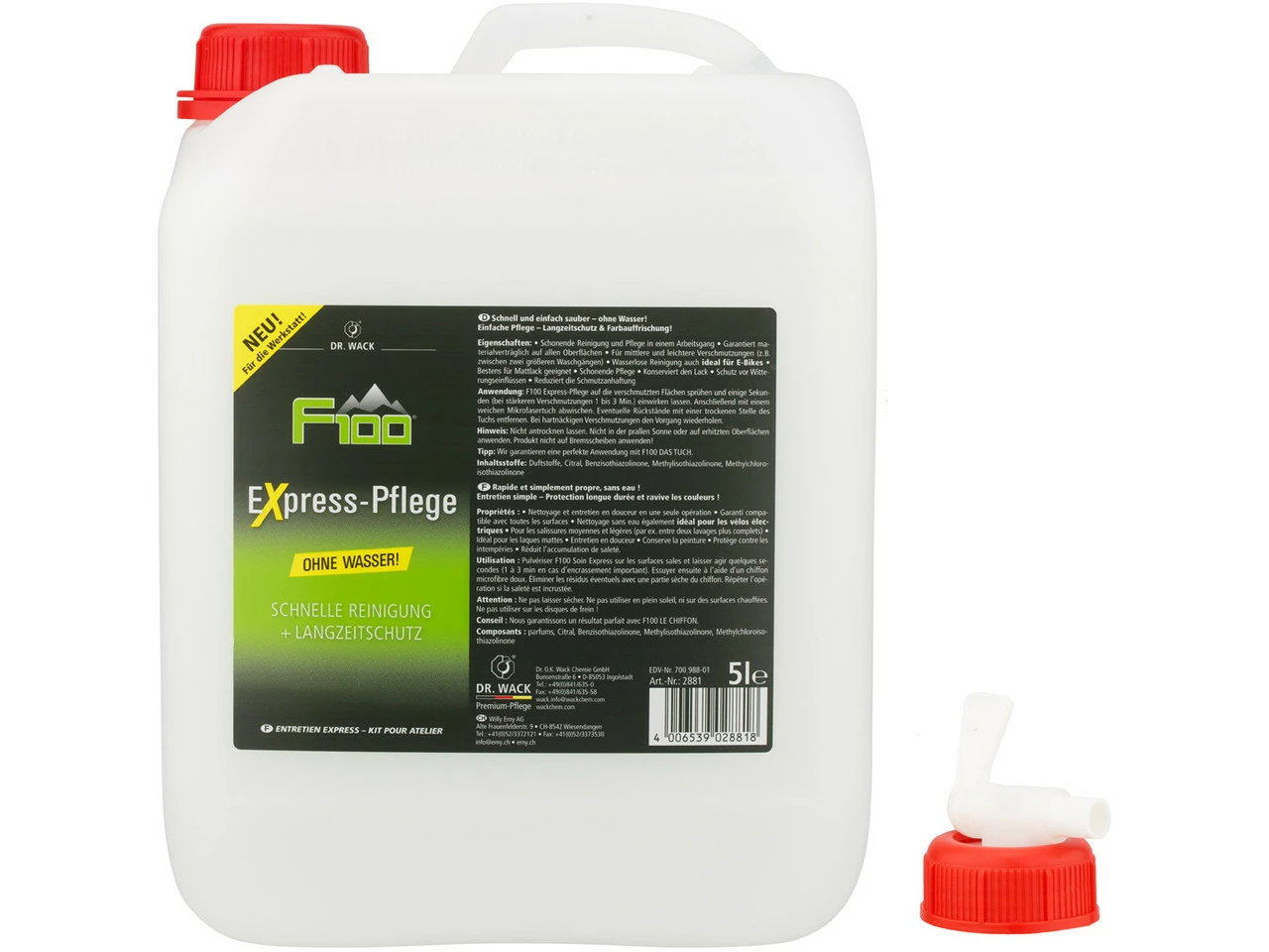 Con el paquete de taller de producto de cuidado Dr. Wack F100 Express Care puedes realizar muchas operaciones de limpieza en tu bicicleta o limpiar varias ruedas directamente. Recibirás 500 ml del producto de cuidado Express y además un bote de 5 litros con el que podrás llenar el pulverizador. El producto de cuidado F100 Express de Dr. Wack es un producto de limpieza y cuidado en uno. Se puede aplicar rápida y fácilmente sin agua. La suciedad media y ligera se puede eliminar fácilmente entre dos ciclos de lavado más grandes. El cuidado F100 Express se caracteriza por una compatibilidad de materiales especialmente alta. También preserva el barniz, protege contra la intemperie y reduce la adherencia de la suciedad. ¡Sólo rocíalo, límpialo, listo!