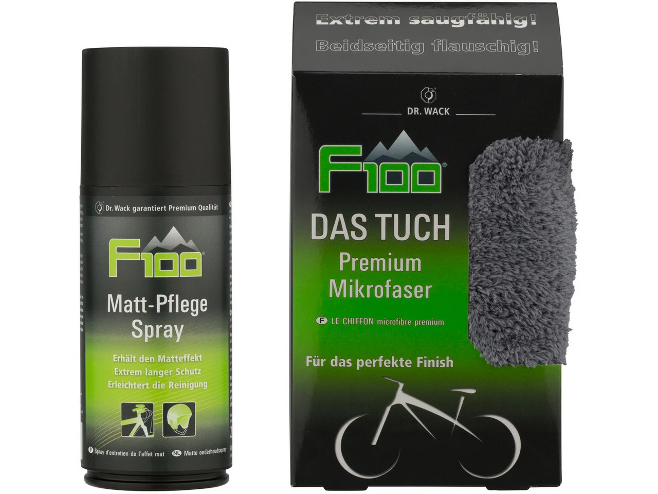 El set de cuidado F100 Matt de Dr. Wack está especialmente diseñado para la limpieza, el cuidado y la protección de las superficies mates, ya sean barnizadas o de plástico. El Spray F100 Matt Care, junto con el paño de microfibra F100, forman un equipo imbatible a la hora de limpiar y mantener el acabado mate de los cuadros, cascos o componentes. Tu bici quedará limpia de nuevo en poco tiempo y con toda seguridad no quedará pulida a un alto brillo.