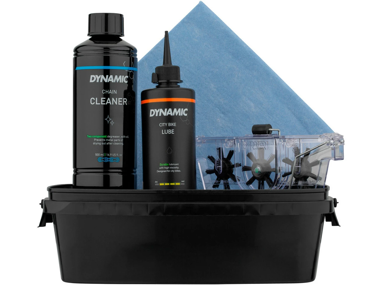 El paquete de cuidado de cadenas de Dynamic contiene 500 ml de limpiador de cadenas, 250 ml de aceite de cadenas, una herramienta de limpieza de cadenas y un paño de limpieza. En la práctica caja de almacenamiento tienes a mano todo lo necesario para el cuidado de la cadena de tu bicicleta.