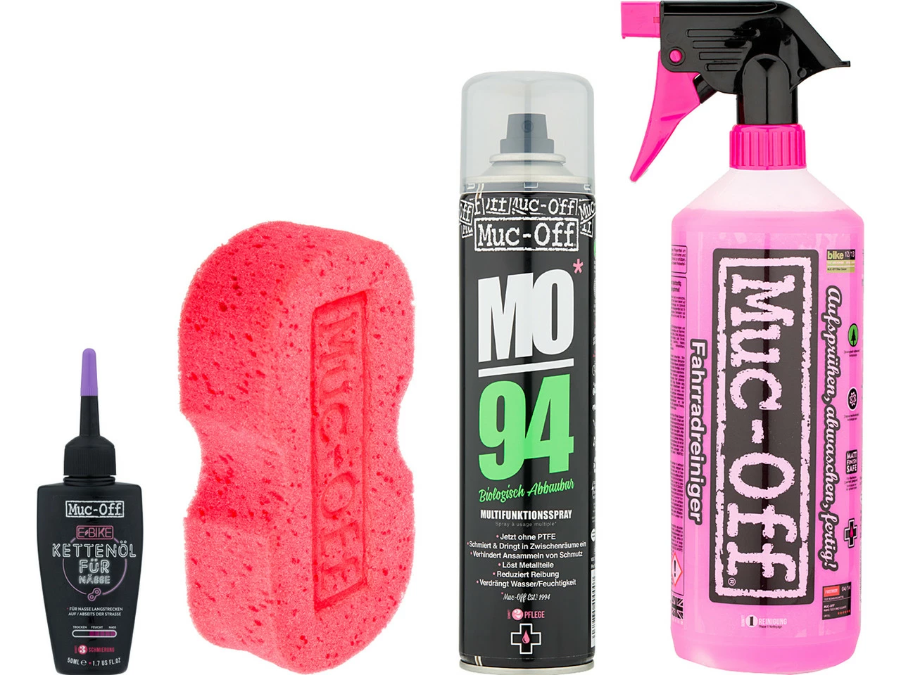 1 x Limpiador de bicicletas Muc-Off Bike Cleaner, 1 Litro1 x Lubricante Muc-Off MO-94, 400 ml1 x Lubricante de cadenas Muc-Off E-Bike Wet Chain Lube, 50 ml1 x Esponja Muc-Off Microcell Sponge
