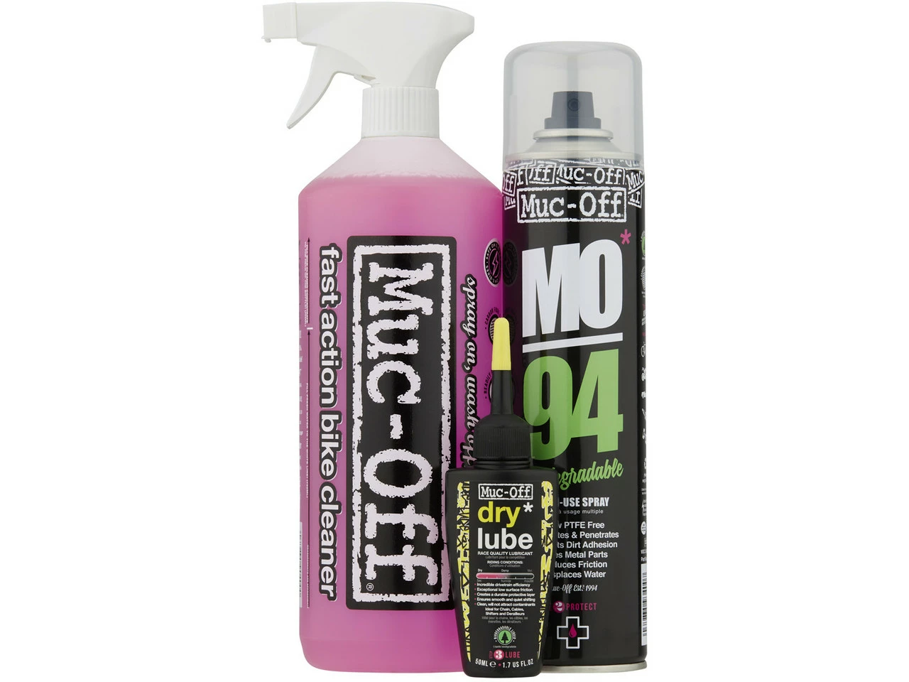 El Wash, Protect, Dry Lube Kit de Muc-Off es un set para el cuidado integral de tu bicicleta. Contiene el limpiador de bicicletas Nano Tech Bike Cleaner, el lubricante MO-94 y el aceite para cadenas Dry Lube.