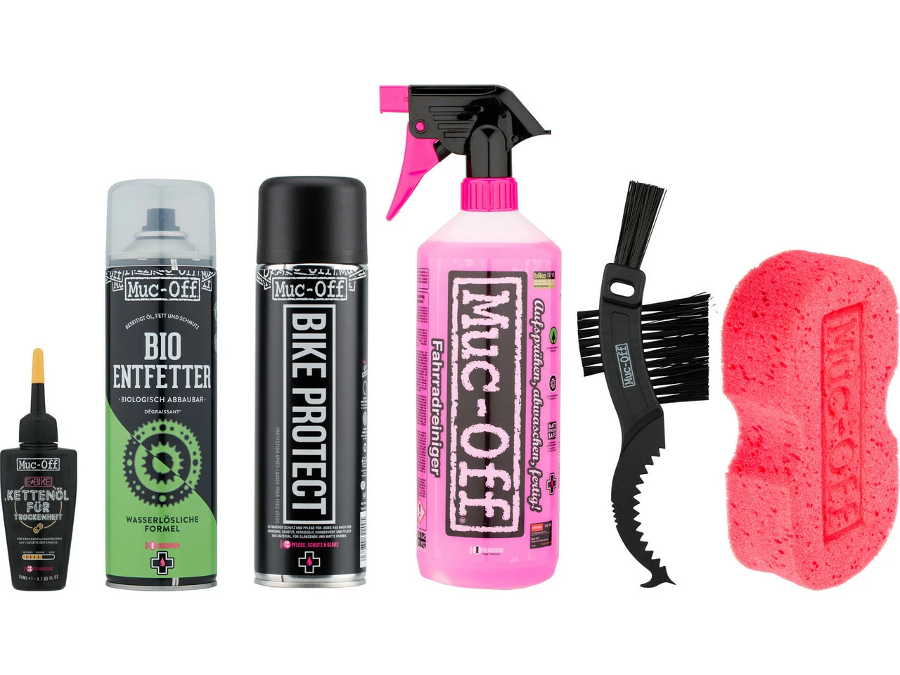 1 x Limpiador de bicicletas Muc-Off Bike Cleaner, 1 Litro1 x Aerosol de cuidado Muc-Off Bike Protect, 500 ml1 x Desengrasante Muc-Off Bio De-Greaser, 500 ml1 x Lubricante de cadenas Muc-Off E-Bike Dry Chain Lube, 50 ml1 x Esponja Muc-Off Expanding Microcell Sponge1 x Cepillo Muc-Off Claw Brush