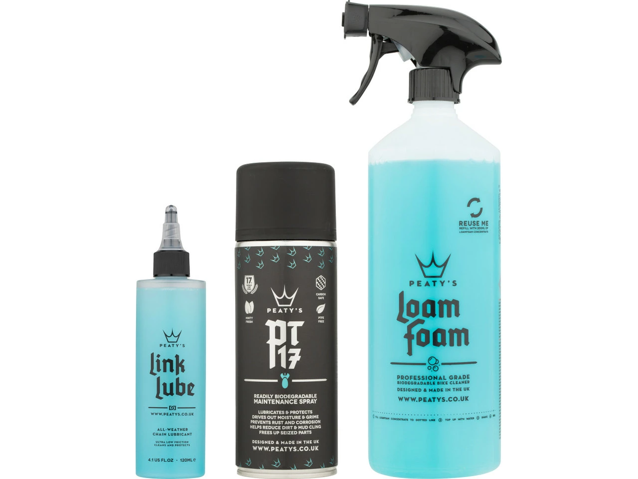 Volumen de envío:1 x Solución detergente Peaty's Loam Foam Bike Cleaner, 1000 ml1 x Spray Peaty's PT17 Maintenance, 400 ml1 x Aceite para cadenas Peaty's Link Lube All-Weather, 120 ml1 x Cabez