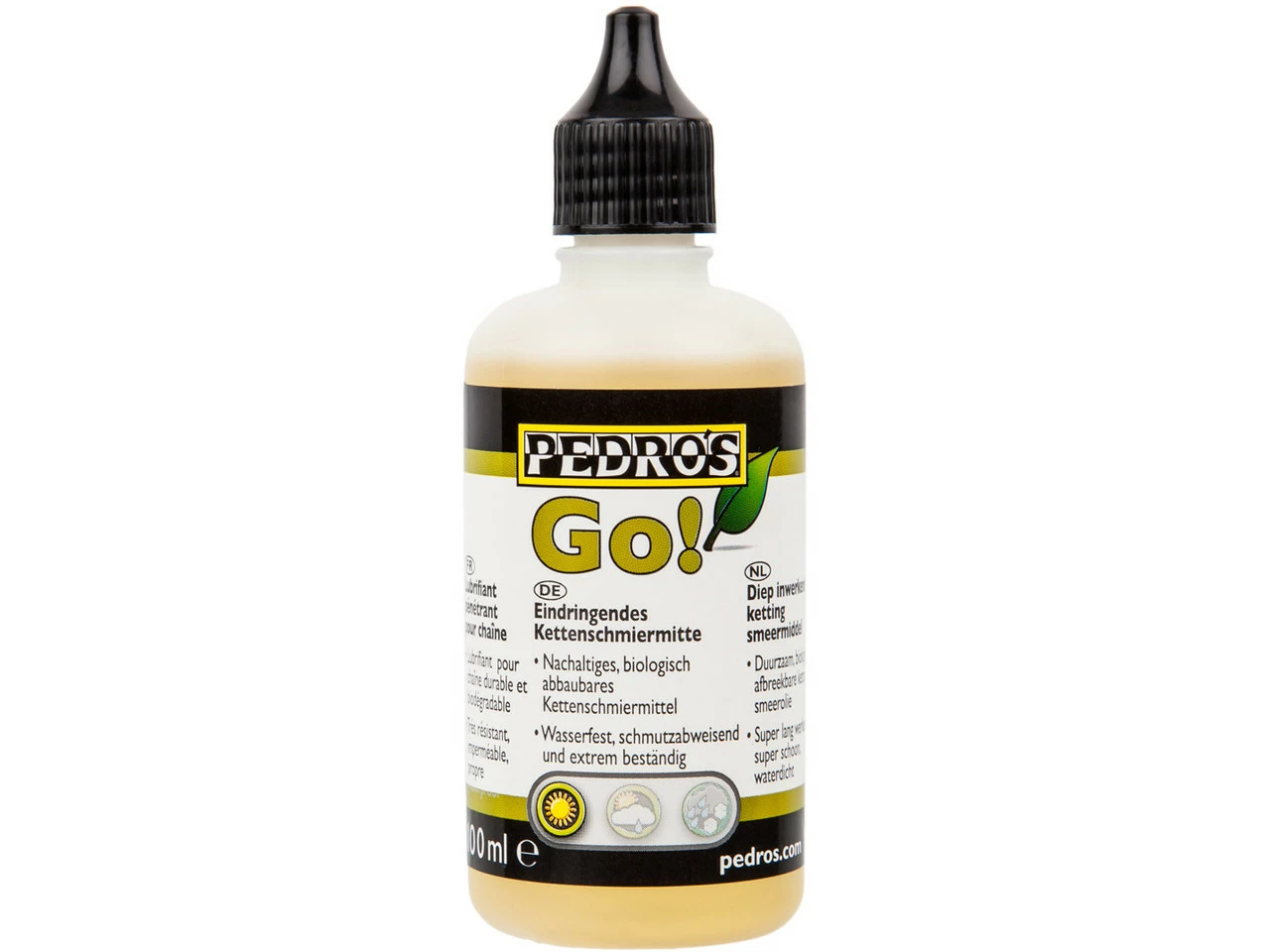 El Pedros GO! El lubricante para cadenas es un lubricante de base vegetal de baja viscosidad que se adapta de forma óptima a condiciones secas y húmedas. Debido a su baja viscosidad, penetra bien entre los eslabones de la cadena protegiendo de la suciedad y del agua durante mucho tiempo.