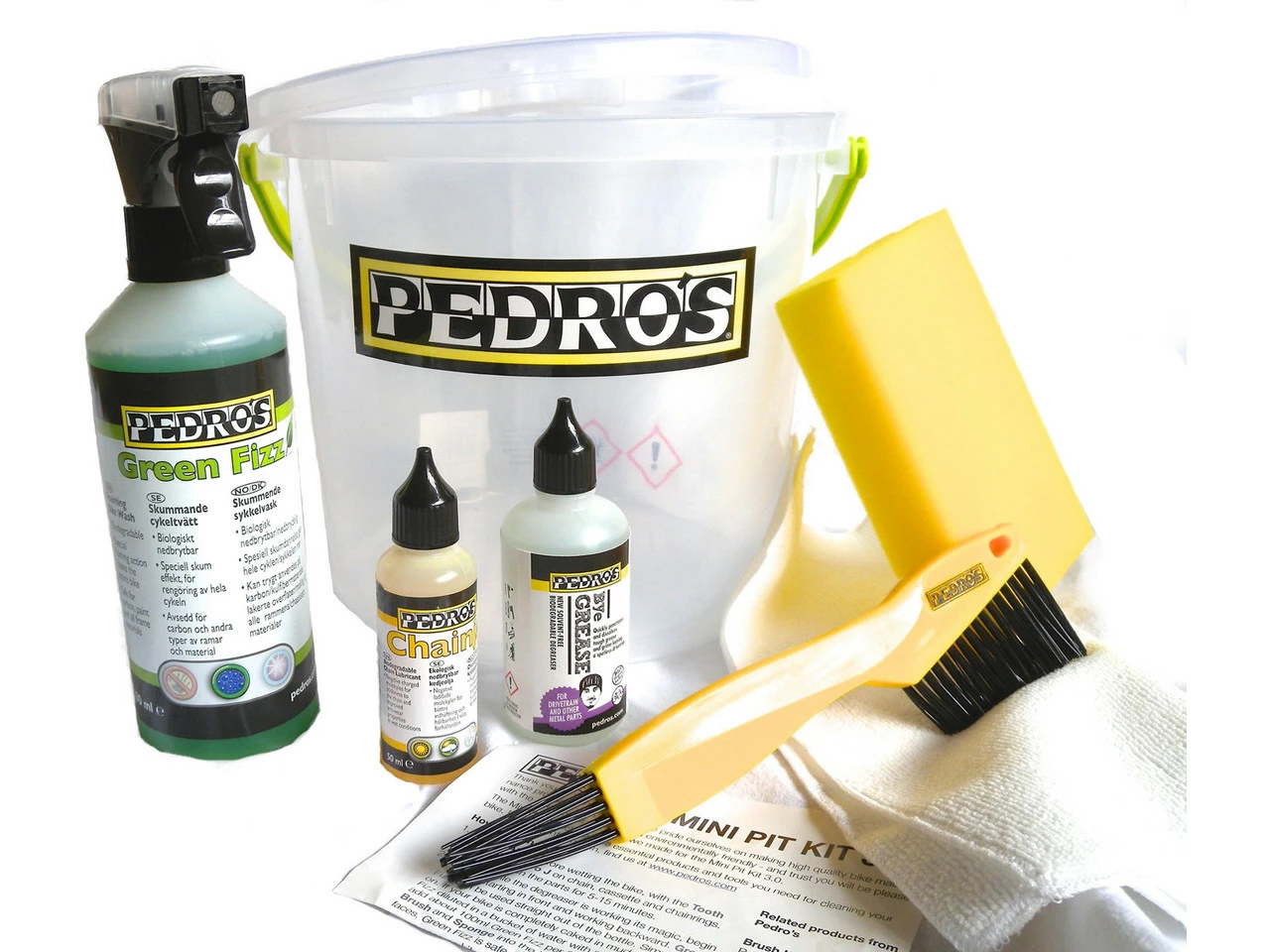 1 x Limpiador Pedros Green Fizz 500 ml1 x Desengrasante Pedros Bye Grease 100 ml1 x Lubricante de cadenas Pedros Chainj 100 ml1 x Esponja1 x Cepillo de limpieza Toothbrush1 x Paño de microfibras1 x Cubo de plástico de 7 Litros