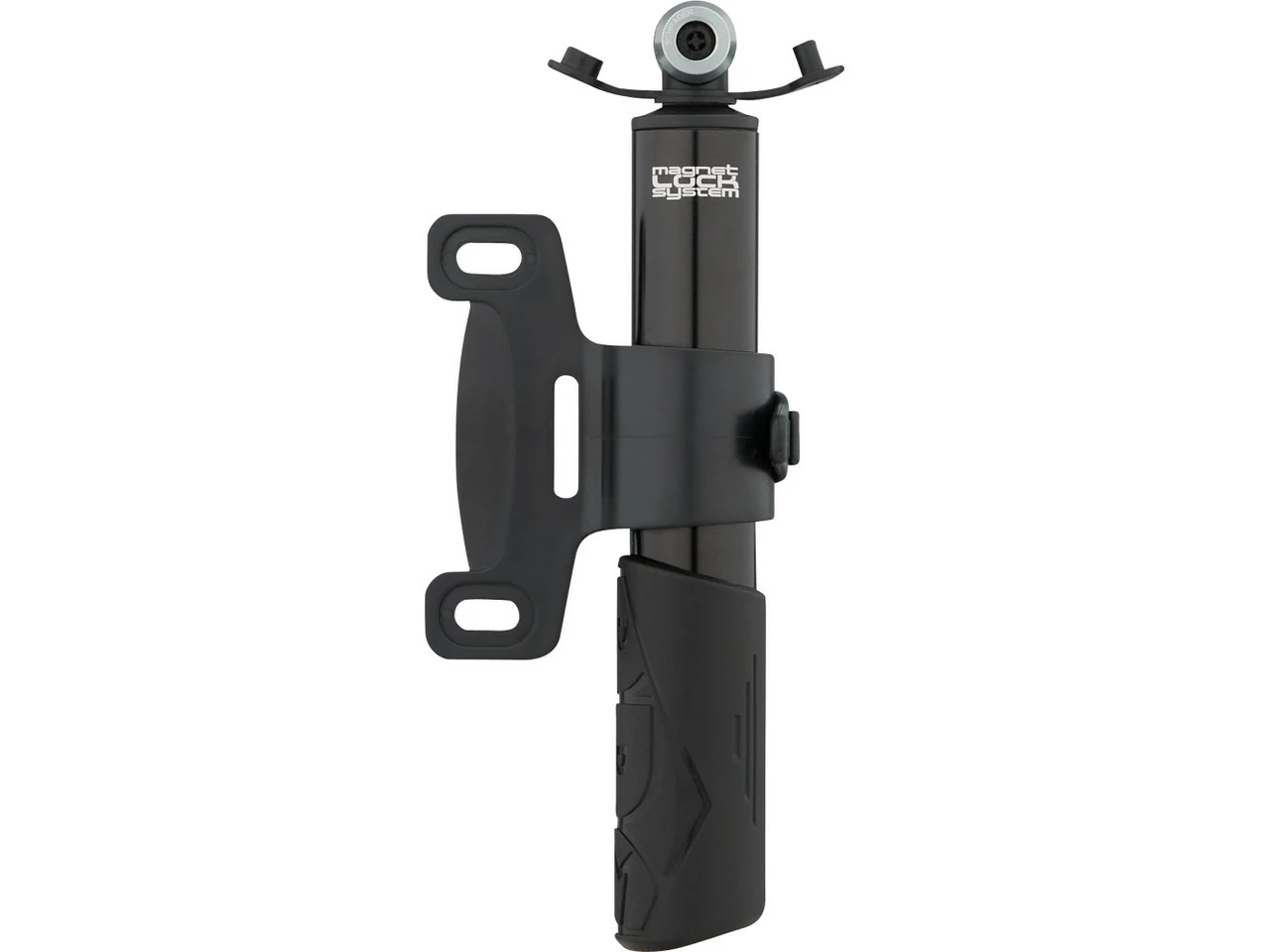 El cabezal de la mini bomba PRO Performance XS se enrosca directamente en la válvula de la cubierta y bombea hasta 8 bares de aire en su interior. Cuando no se está utilizando la bomba, el inteligente sistema de bloqueo magnético mantiene la bomba plegada con un tamaño de sólo 16 cm de longitud.