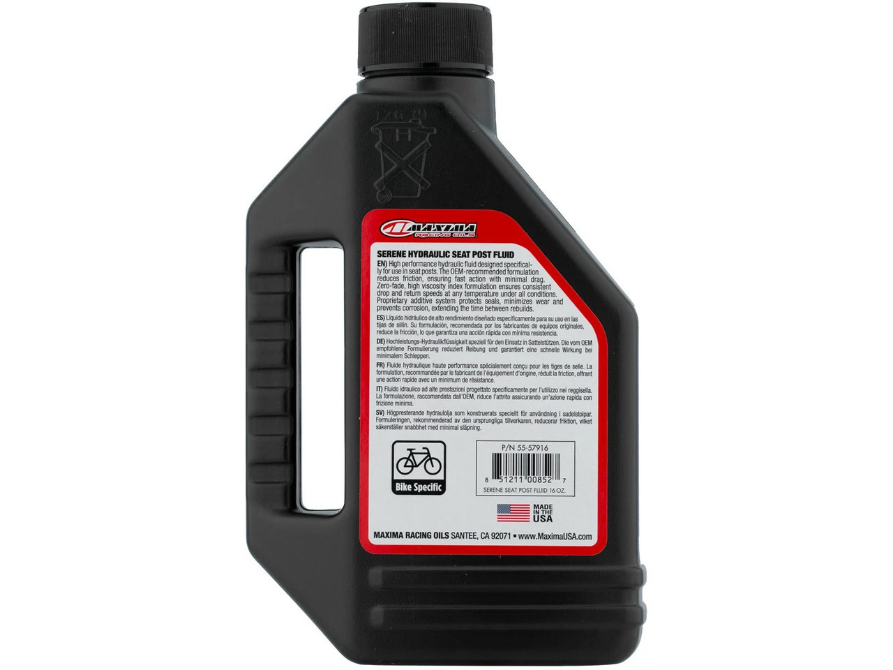 El líquido para tijas de sillín Maxima Serene de RockShox es un fluido hidráulico de alto rendimiento específico para ser usado en tijas de sillín. La formulación reduce la fricción y asegura una acción rápida con un mínimo de arrastre.