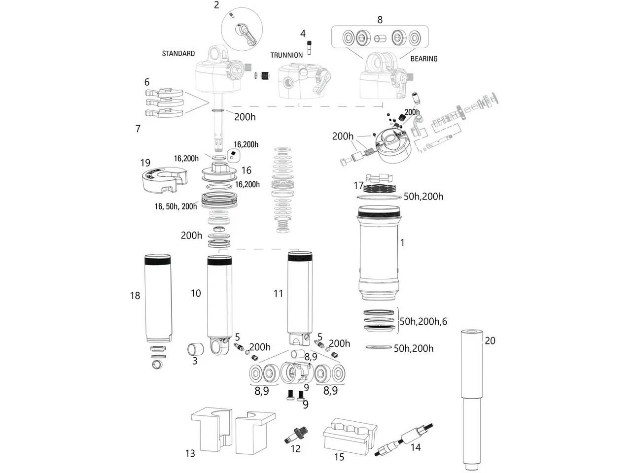 Kit de mantenimiento 50 horas para amortiguadores Deluxe / Super Deluxe (A1-B2, 2017-2020), con juntas de cámara de aire, junta de pistón, anillos guía, grasa/aceite para juntas