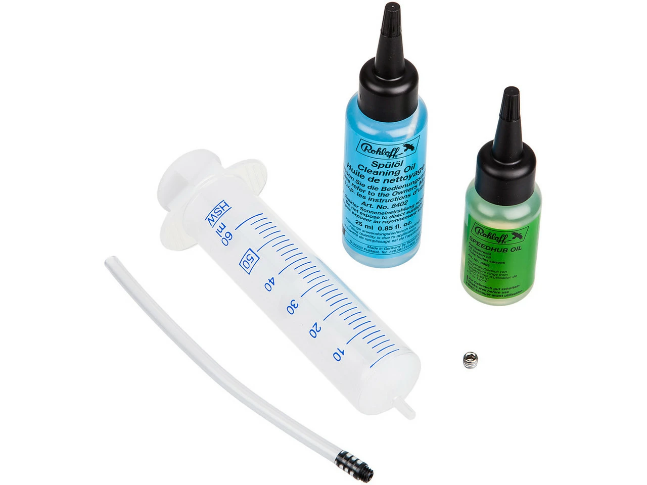 1 x Aceite detergente Rohloff (25 ml) en botella de 50 ml1 x Aceite para todo el año Rohloff (25 ml)1 x Jeringa desechable Rohloff1 x Manguera de llenado de aceite Rohloff1 x Tornillo de purga de aceite Rohloff