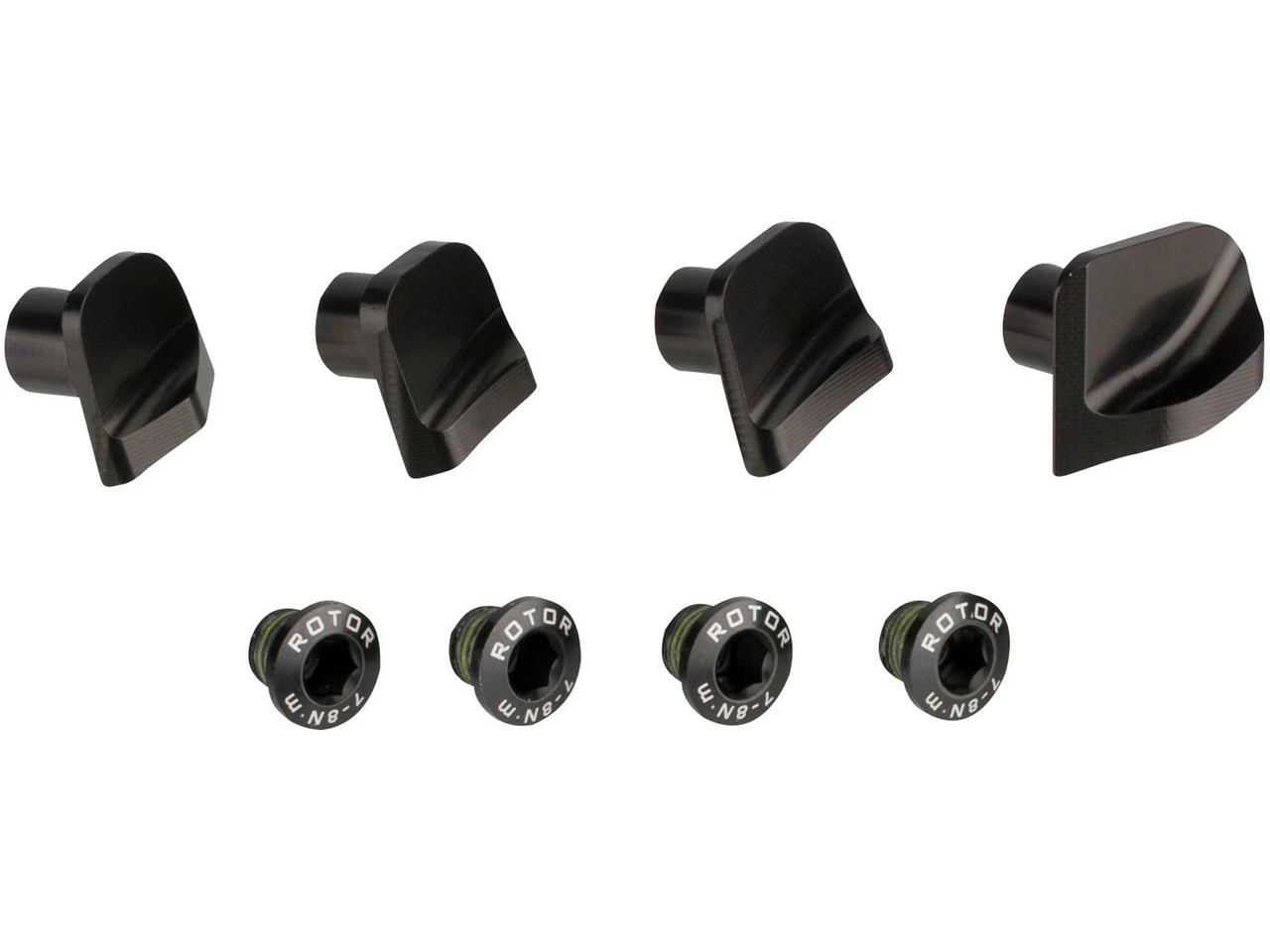 Set de tornillos de platos con tapas integradas para una transición limpia de Q-Rings a bielas Shimano Dura Ace R9100 con araña de 4 brazos y círculo de agujeros 110×4. Fresado por CNC duradero gracias a su superficie anodizada dura.