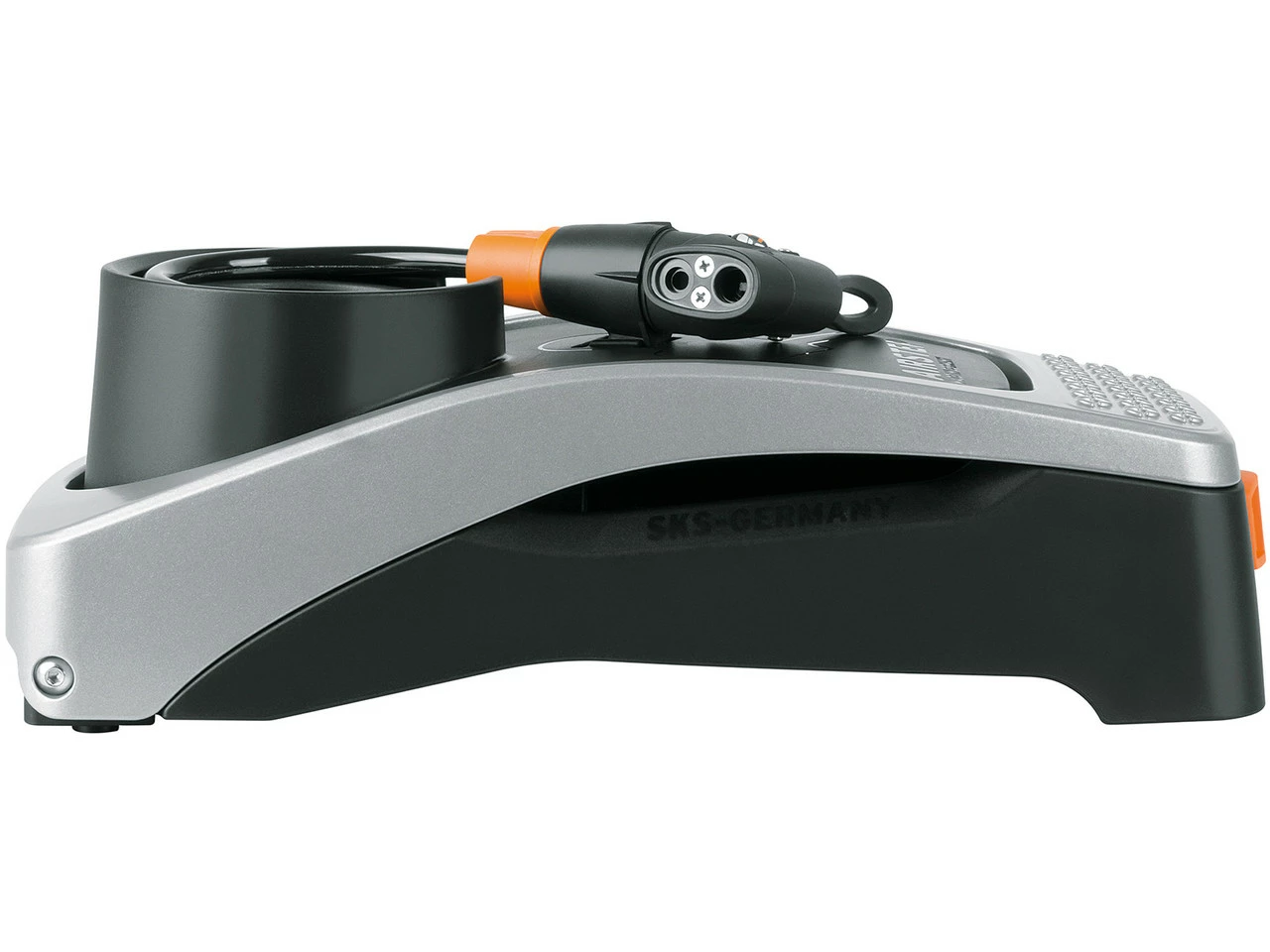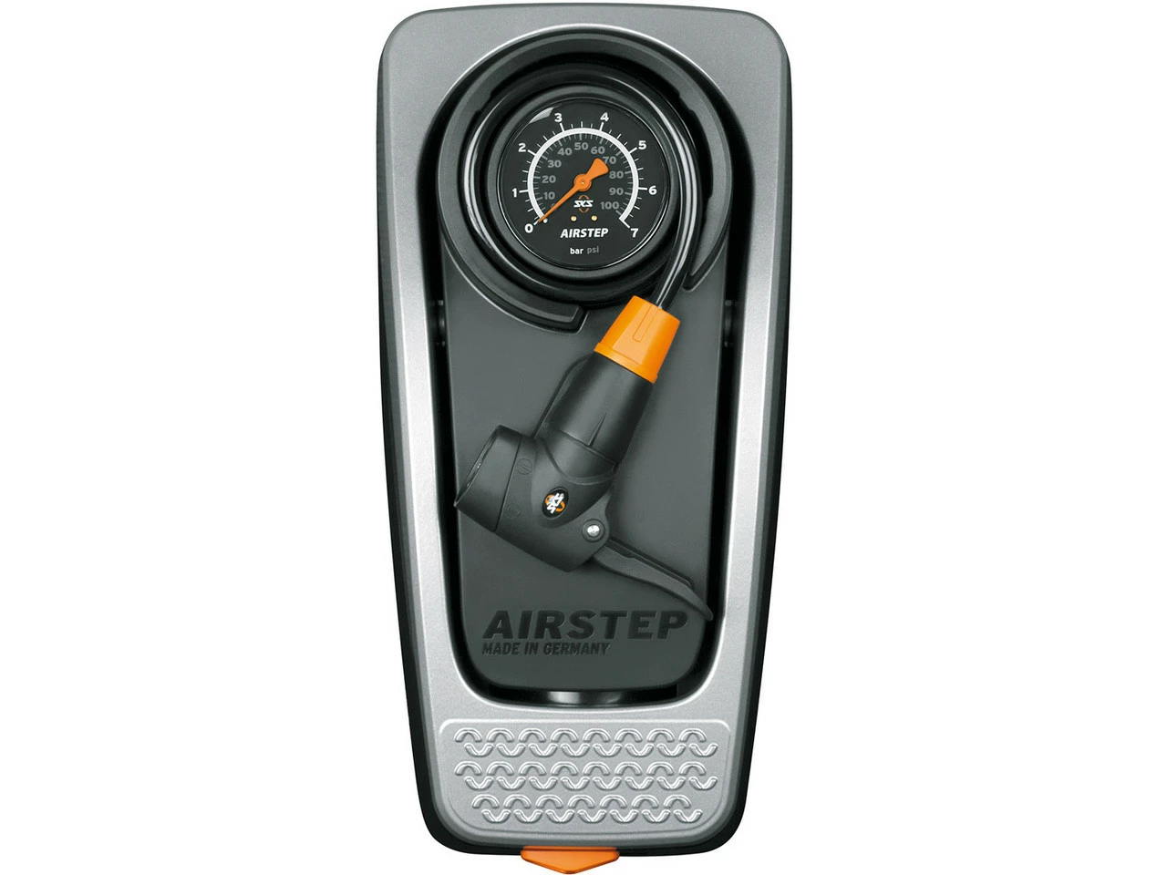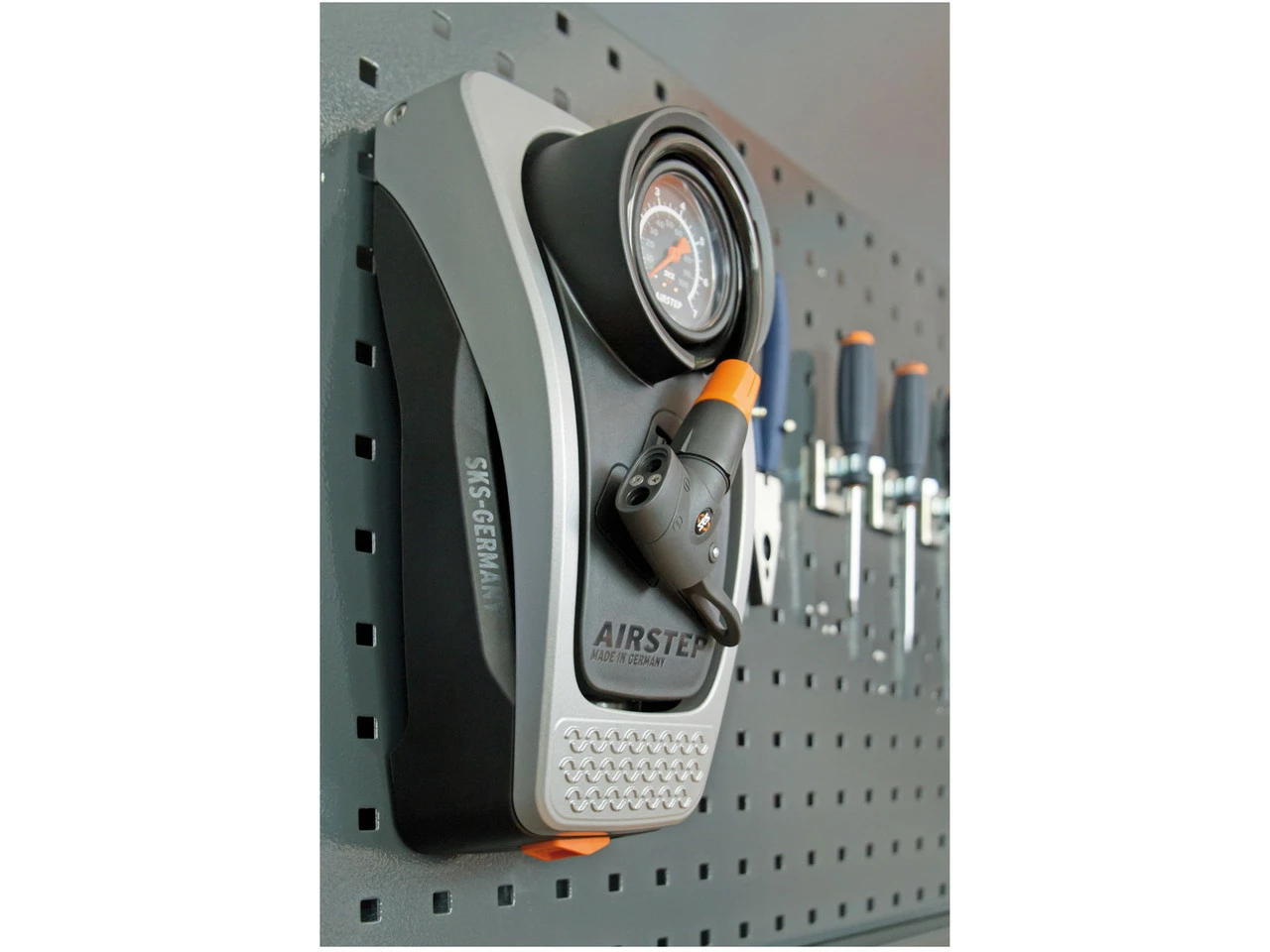 La bomba de pie Airstep de SKS combina las virtudes de una bomba de pie clásica con la tecnología más avanzada. Materiales de primera calidad, un diseño sofisticado y características de fácil manejo, como el gran manómetro, el espacio de almacenamiento integrado para la manguera en espiral y el cabezal MultiValve para todo tipo de válvulas, le dan a la bomba un aspecto completamente nuevo e innovador. Si se maneja la barra de aluminio de forma ergonómica, en una postura erguida cuidando la posición de la espalda, se puede alcanzar la mayor capacidad de bombeo efectiva posible de hasta 7 bar. Tras el bombeo, el soporte se vuelve a plegar y se bloquea mediante un interruptor. Así, la bomba compacta puede guardarse ahorrando espacio gracias al soporte de pared.