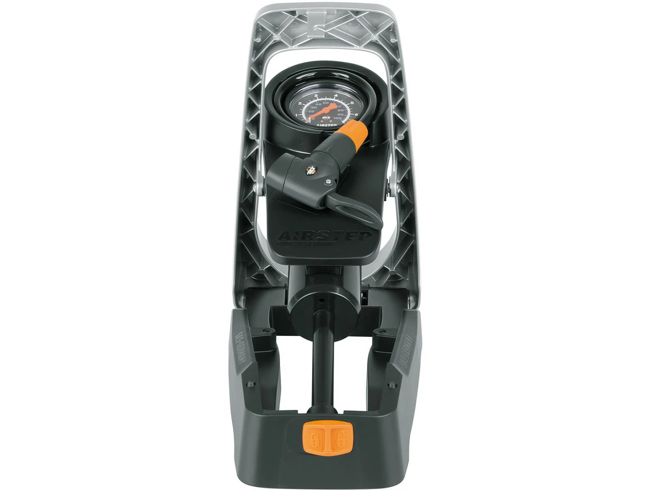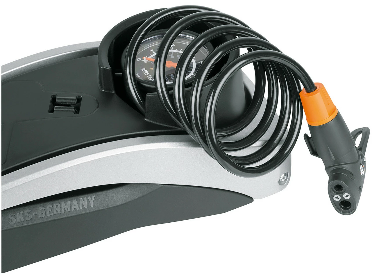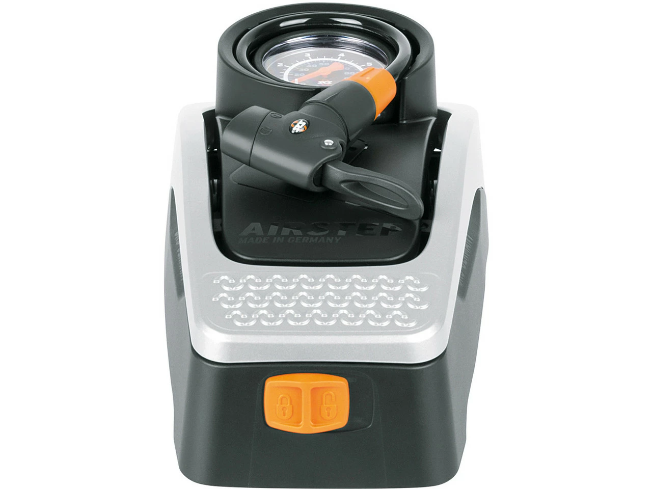 La bomba de pie Airstep de SKS combina las virtudes de una bomba de pie clásica con la tecnología más avanzada. Materiales de primera calidad, un diseño sofisticado y características de fácil manejo, como el gran manómetro, el espacio de almacenamiento integrado para la manguera en espiral y el cabezal MultiValve para todo tipo de válvulas, le dan a la bomba un aspecto completamente nuevo e innovador. Si se maneja la barra de aluminio de forma ergonómica, en una postura erguida cuidando la posición de la espalda, se puede alcanzar la mayor capacidad de bombeo efectiva posible de hasta 7 bar. Tras el bombeo, el soporte se vuelve a plegar y se bloquea mediante un interruptor. Así, la bomba compacta puede guardarse ahorrando espacio gracias al soporte de pared.