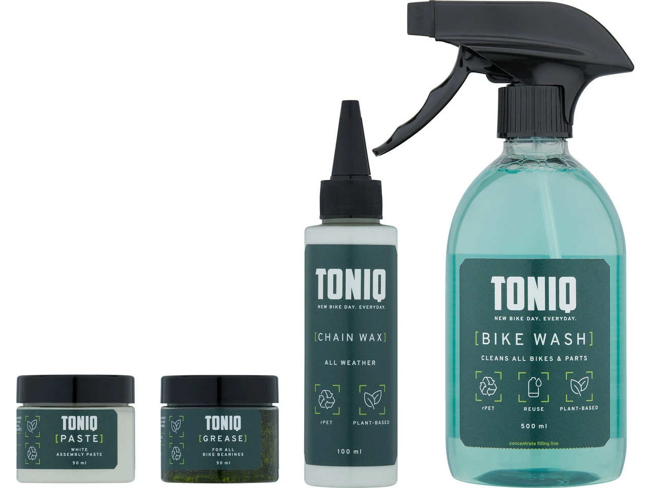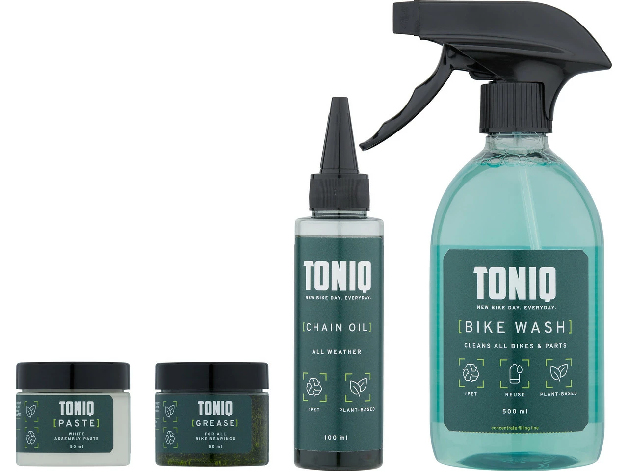 1 x Limpiador de bicicletas TONIQ Bike Wash 500 ml1 x Pasta de montaje TONIQ Assembly Paste 50 ml1 x Grasa para rodamientos TONIQ Bearing Grease 50 ml1 x Cera para cadenas TONIQ Chain Wax 100 ml