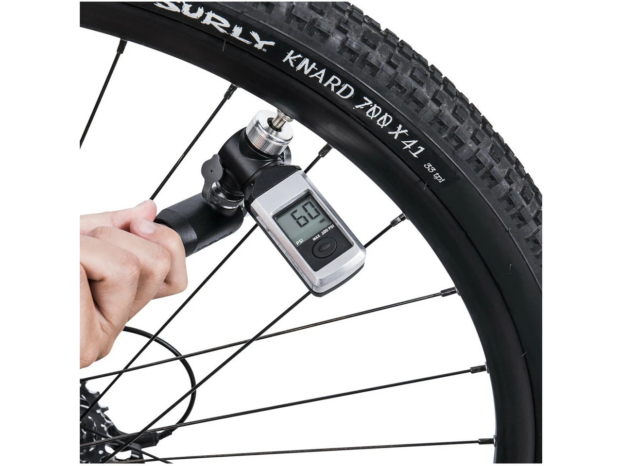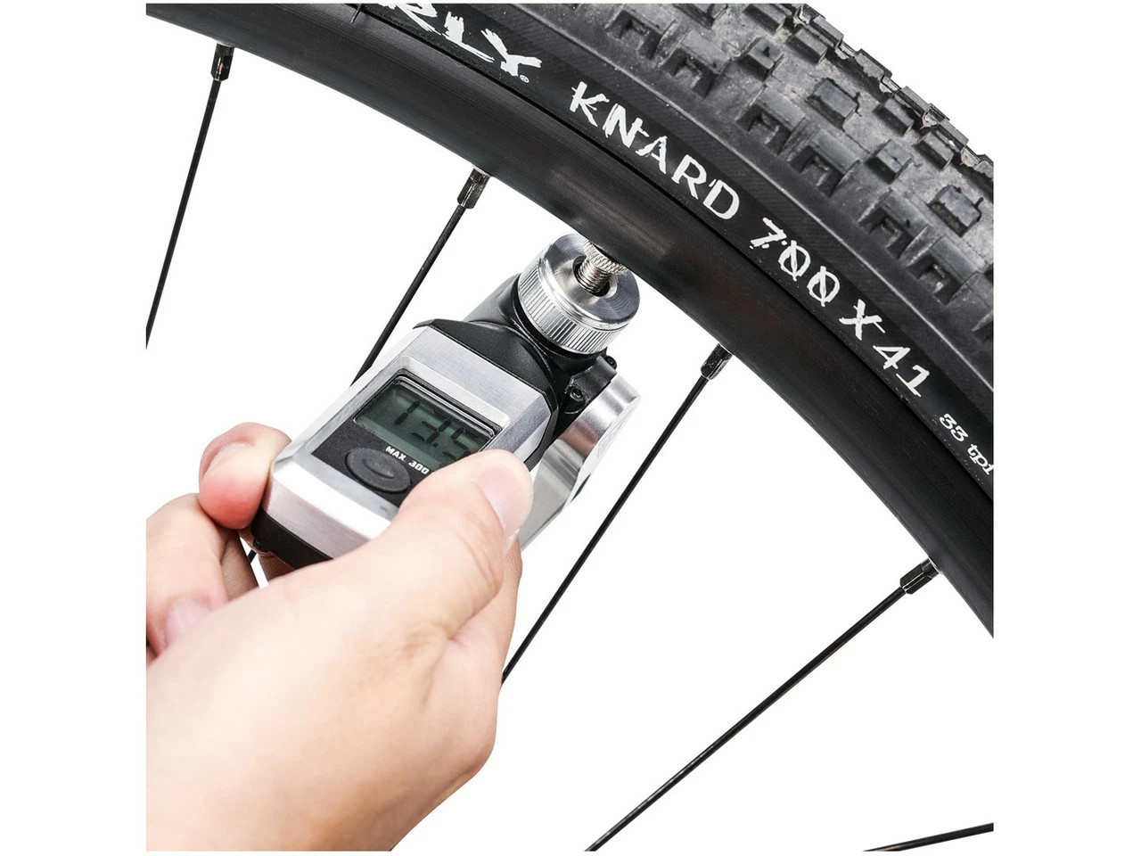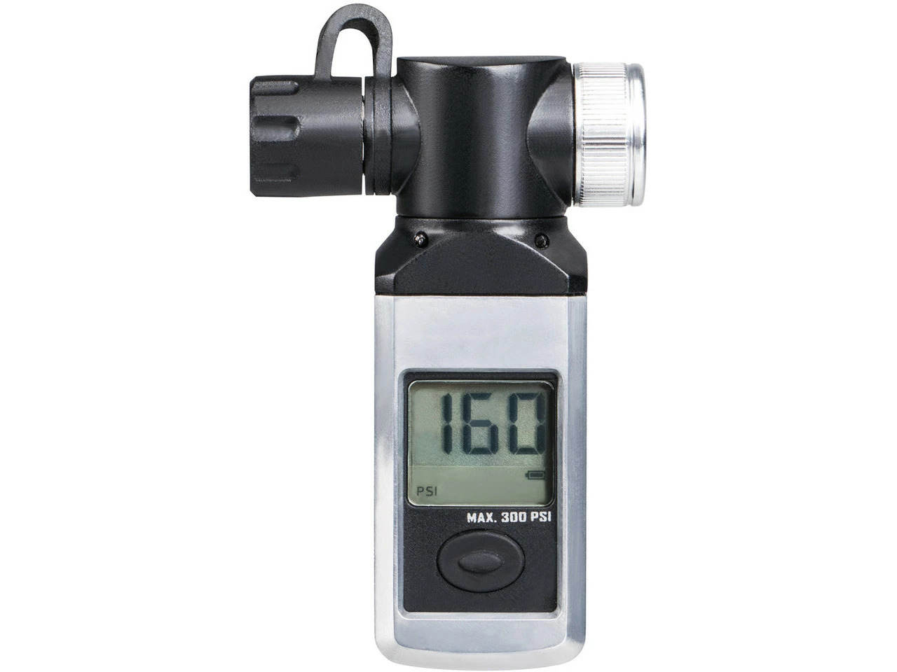 La pantalla digital, de fácil lectura, puede ser conectada a una bomba o utilizada sola. Proporciona medidas de presión precisas de hasta 20,7 bar. La cabeza de válvula de libre rotación es adecuada para válvulas Presta, Schrader o Dunlop. La palanca de bloqueo del pulgar asegura una conexión hermética.